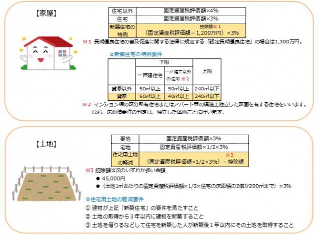 課税標準額とは税金計算用に調整された金額のことであり、土地であれば評価額の2分の1、建物であれば評価額そのままが基本になります。そこに原則3%の税率を掛けて税額を出しますが、住宅用不動産には軽減措置が設けられています。