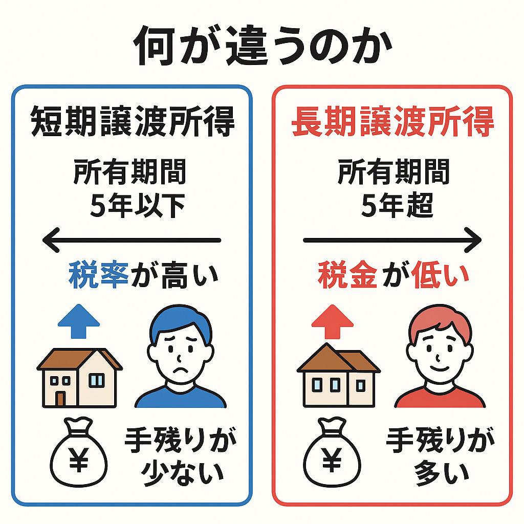 土地や建物を売った利益(譲渡所得)は、所有期間が5年超かどうかで「長期」と「短期」に区分されます。